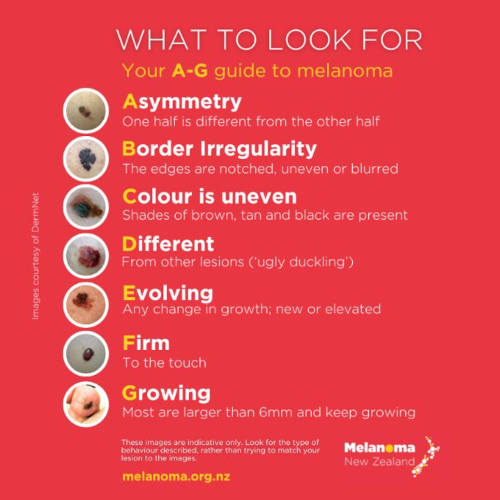 Refer to our A-G guide to melanoma (below) to know what to look for when you’re self-checking your skin, or watch our video guide here.